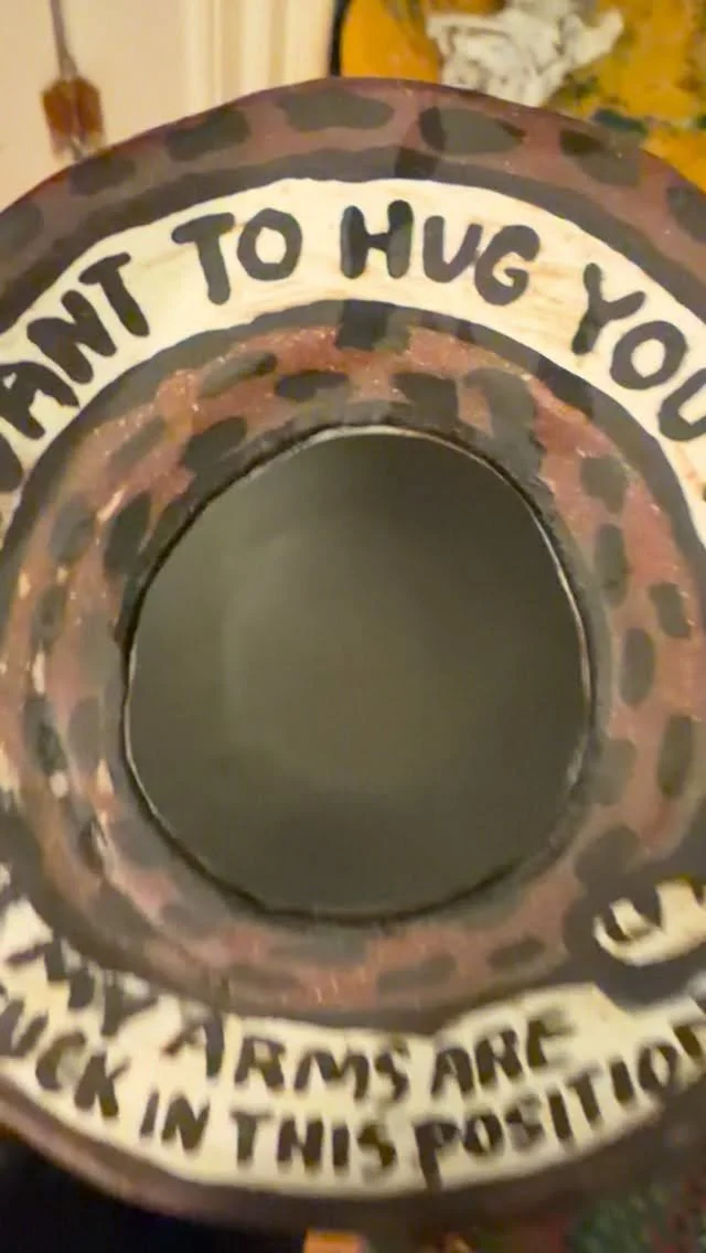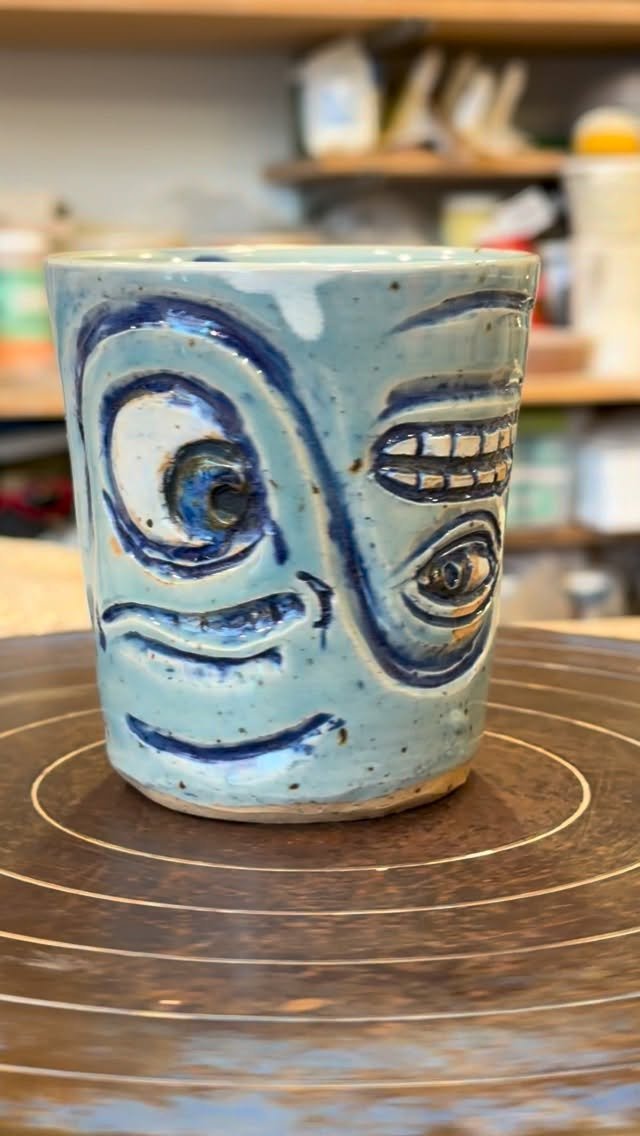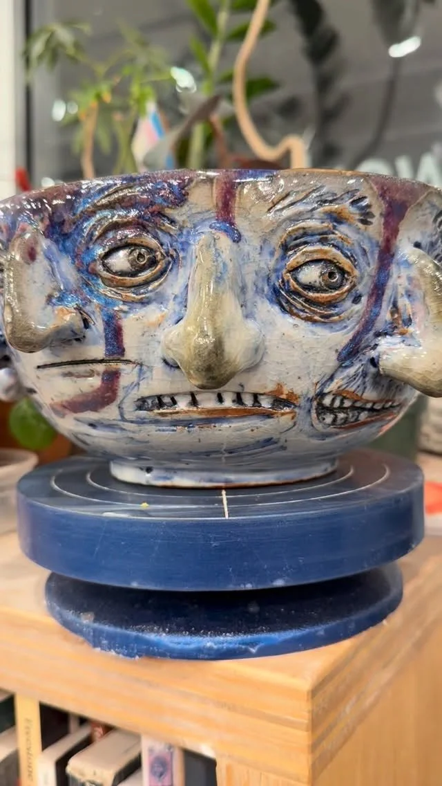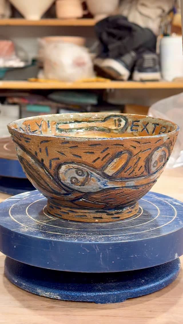 I’m not good at using the wheel, so I take the unwanted dishes at the studio and add faces or words to them.